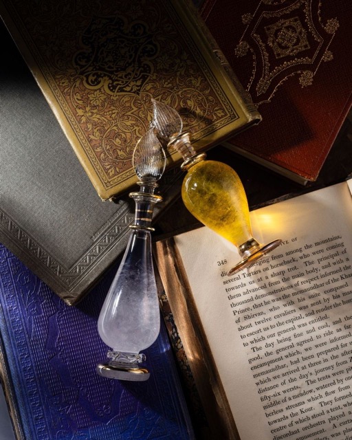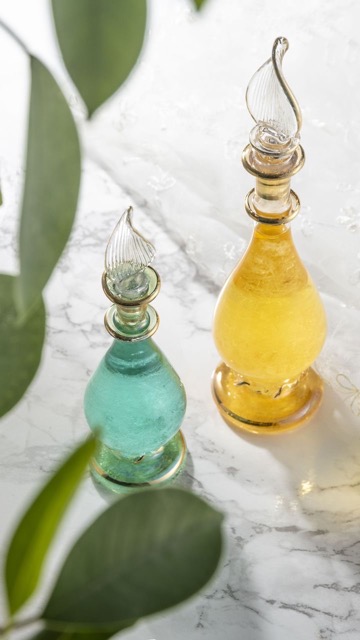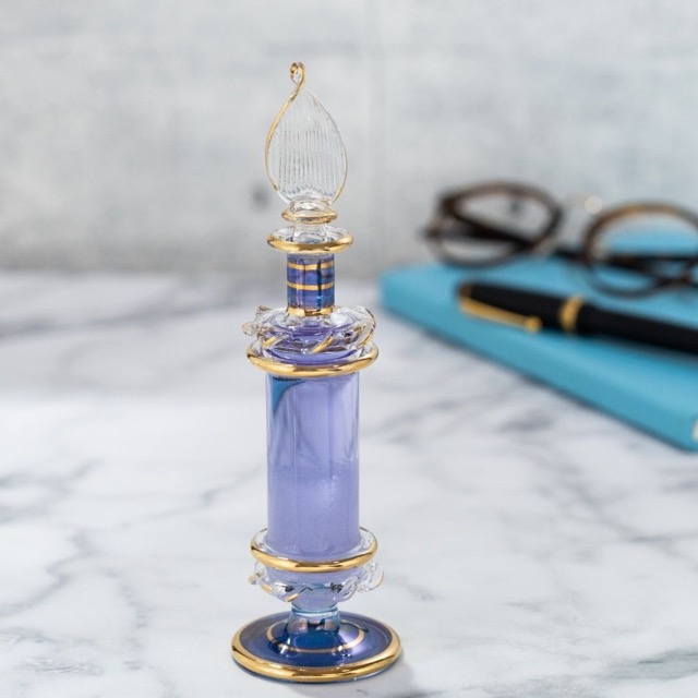 繊細なエジプト香水瓶に、カラフルなストームグラスを詰め込みました。 気温や気圧によって変化する結晶の変化を、日々楽しんでいただけますように__。