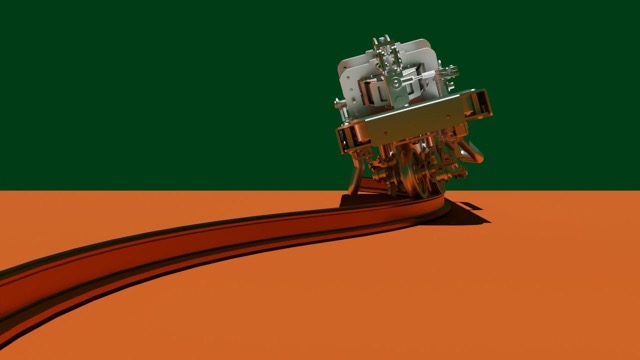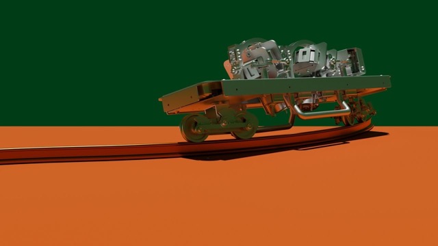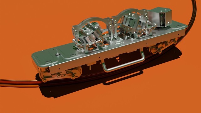 - ジャイロモノレールは一本のレールの上を転倒しないようにバランスをとりながら走る鉄道車両です。 20世紀初頭にイギリスとドイツで実際に人を乗せて走ることのできる車両が試作されました。 当時と同様にコンピュータ等を使わずにメカニカルな仕組みでバランスをとる模型を製作しました。 実際にレール上を走行させて展示します。
