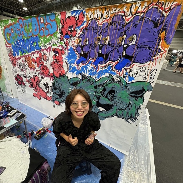 - 2023年よりライブペイントを始め、デザインフェスタを始めとする大型イベントや、展示、音楽イベント等様々なイベントにてパフォーマンスを披露。自身が創る作品やグッズにはアニマルモチーフを使い、【悪夢も夢のうち】をテーマに"見た事ない筈なのに見た事ある"作品達を創っています。貴方の生活に彩りを添えられますように。