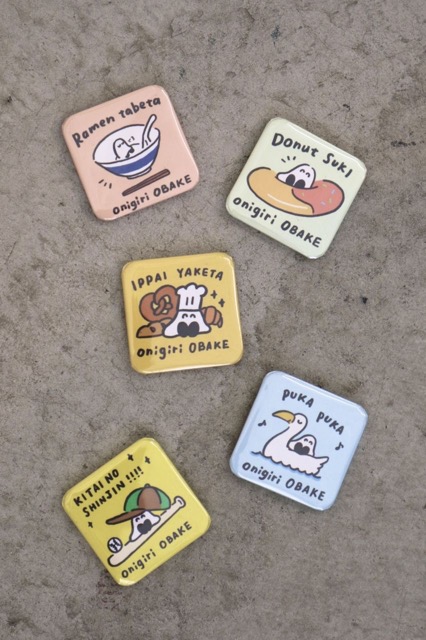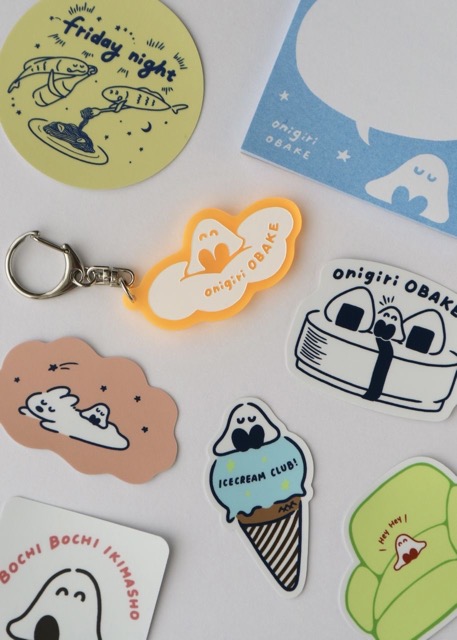 - オリジナルキャラクターの”おにぎりおばけ”はその名の通りおにぎりみたいなおばけ!いつもごきげんでのんきなおにぎりおばけとその仲間たちのグッズを販売いたします。ステッカーやポストカードはもちろん、新作のグッズもあるのでお楽しみに〜〜!