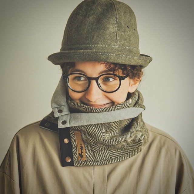 - 使い勝手を考えたバックやウエア、版画プリントが特徴的なブックカバーなどを製作しています。冬のシーズンに活躍するスナップボタンで止められるマフラーや丸っと可愛いシルエットのハット、ボディーバックを展示します。