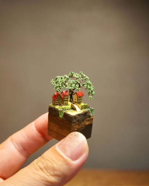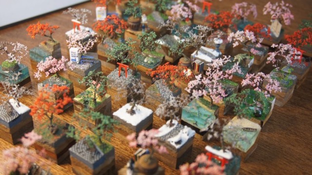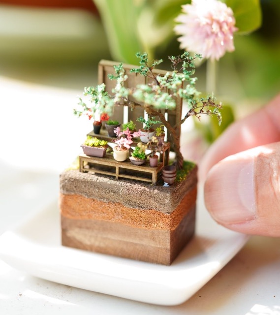 - ひとくちサイズのミニチュアガーデン・テラリウムブロックの展示販売を行います。大きさ2センチほどの組み木に自然の情景などを再現したミニチュア作品です。まるで本物の植物に見えますが、全てジオラマ用の材料を用いた造花になります。