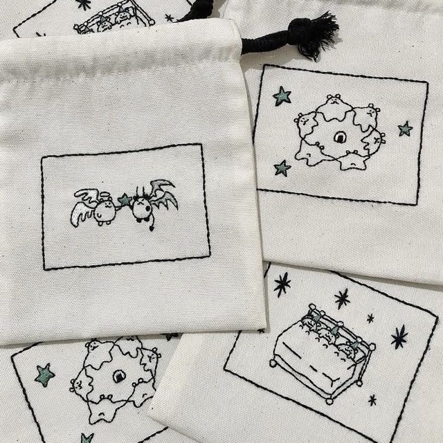 くすっと癒されるイラストを刺繍で表現。ポーチや巾着にして癒しをいつも持ち歩けます。