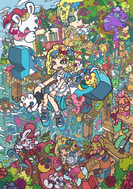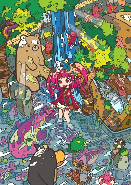 - カラフルでフラットな色と、ごちゃごちゃした世界観が特徴的な絵師だと思います。ステッカーやポストカード、キャンバスプリントや、一点ものの色紙などを販売します。