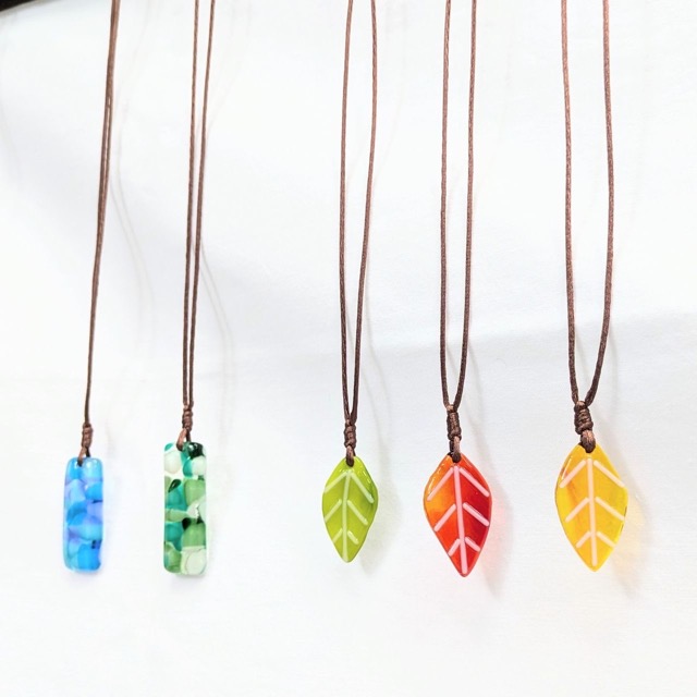 - 工芸用色板ガラスをカットして溶かし合わせる技法で、アクセサリー等を制作。クリスマスツリー、小皿、一輪挿し等もございます。葉っぱのアクセサリーを目印にお越し下さい。