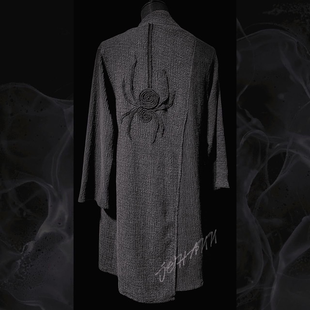 - 伝統技術×モード/パンク 黒を基調としたジェンダーフリーなアイテム。フォーマルにも活躍するシックなデザインの他、ダークな世界観の装飾を施したファンタジックな作品も展示販売いたします。糸の繊細な陰影と、妖しくミステリアスな深みのある色表現にこだわった日本伝統の上質な織り生地は、身体に馴染む質感で軽やかにお召しいただけます。サイズS〜メンズXLまで対応します。