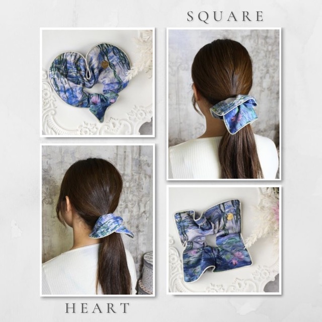 - 結ぶとリボンのようになる「スクエアシュシュ」&「ハートシュシュ」。人と被らない形なので注目を集めること間違いなし♪ 結ぶだけでなく腕に着けてアクセサリー代わりにしても可愛いです。80種類以上の素材・カラーに加え、モネやゴッホなどの有名絵画柄のシュシュもご用意しております♪