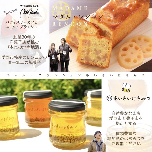 - エール・ブランシュでは、地元食材のレンコンやいちご、地酒などを使った唯一無二の焼菓子をご用意いたします。あいさいはちみつは愛西市と豊田市で養蜂をしています。はちみつはハネムーンの語源。はちみつを口にした人が新婚の様な幸せな気持ちを味わっていただきたいとの思いで、愛西市から名前を貰いあいさいはちみつと名付けました。お客さまの使い方に合ったはちみつを提案させていただきます。