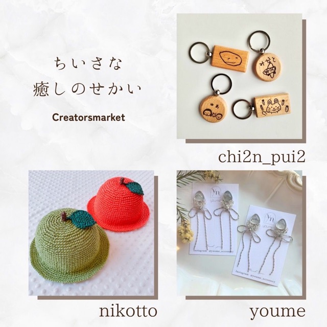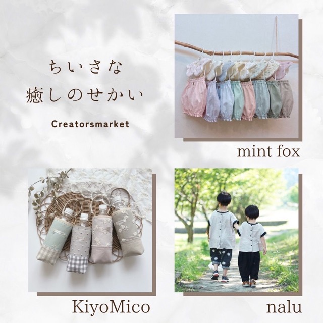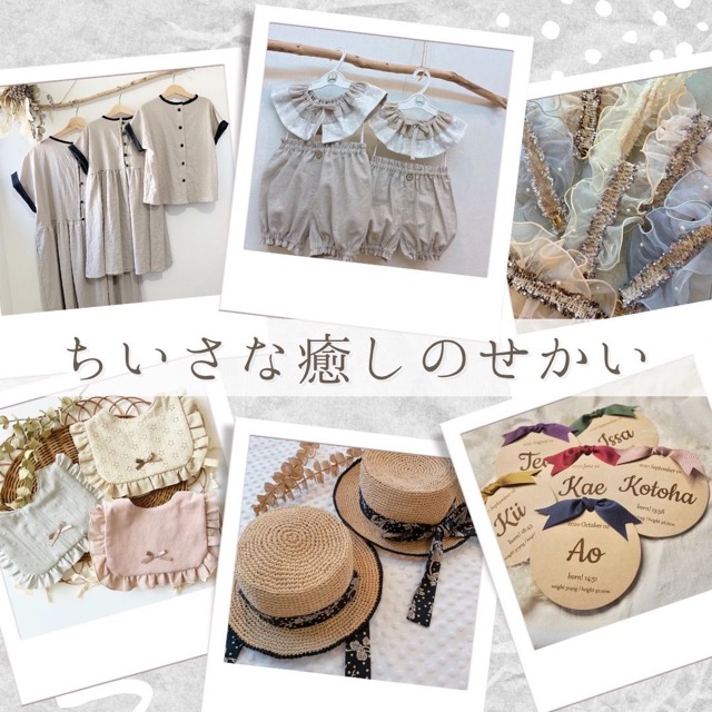 - 「ちいさな子供の物でママがちいさな癒しを得られる場所」6名の作家がお届けします《chi2n-pui2》木のぬくもりレーザー刻印ギフト《KiyoMico》スタイやポーチを中心とした布小物《mint fox》babyにもお洒落なセットアップを..《youme》ナチュラルカラーのアクセサリー商品《nalu》こだわりの綿・麻生地でナチュラルな服と小物《nikotto》かわいい手編みの帽子