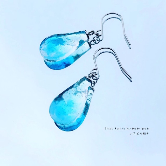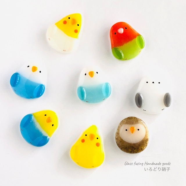 - いろどり硝子では気軽に普段使いできる硝子アクセサリーや小鳥さんの硝子雑貨を中心に制作をおこなっています。(ガラス工芸の1つフュージング『硝子を溶かし融合させる』という技法で制作しています)アクセサリーのパーツは色のついた板硝子をカットしたものを重ね合わせ約800°Cまで上がる電気炉を使って焼成しています。約半日掛けてじっくり焼き上げゆっくり冷まし研磨などをおこないながら1つ1つ丁寧に完成させています