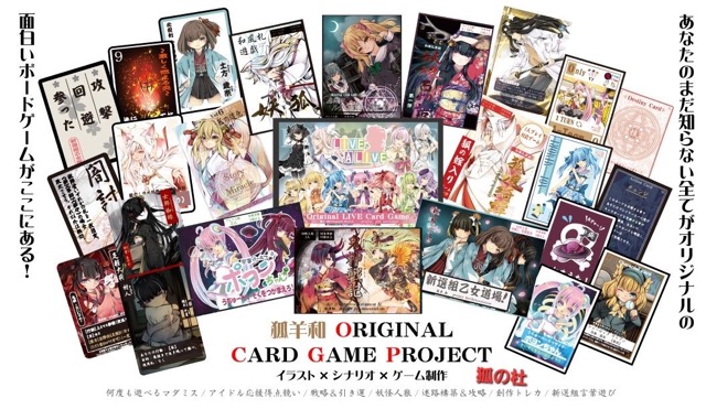 - イラスト×小説×デザイン×ゲーム制作を手掛けたオリジナルカードゲームを販売しています。親子で遊べるものから少し上級者向けのものまで幅広くご用意!少し捻りを加えた新たなアイデアゲームをお届けします! 和風狐版、二人で遊べる妖怪人狼、 何度も遊べるマダミス、アイドル応援得点競い、将棋風引き運戦略ゲームなど