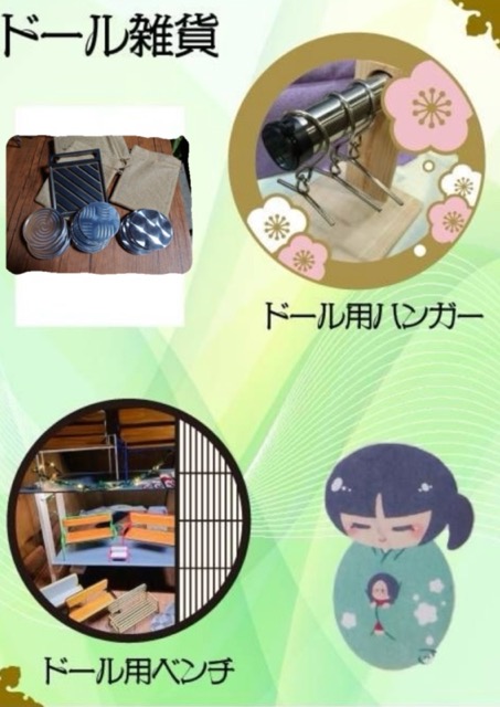 - liberdade→ドール用(ぬいぐるみ用)ベレー帽を中心に抱っこ紐等布製品小物。今回からベレー帽がかぶれる自作のぬいぐるみも連れていきます。うめのあとりえ→ドール用ベンチやドール用ハンガー等ドール用の小物インテリア等にもご利用できます。