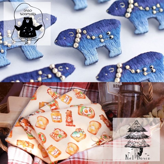 - 刺繍の「orso ricamato(オルソリカマート)」、刺繍×イラストの共同ブランド「Nel Bosco(ネルボスコ)」の合同出展です。 orso ricamatoでは、くまや動物モチーフに季節や空模様を合わせたブローチや布小物を制作しております。 Nel Boscoでは『森の中へ...』をテーマに、今回は森へおでかけに来たクマをイメージした作品を制作いたします。