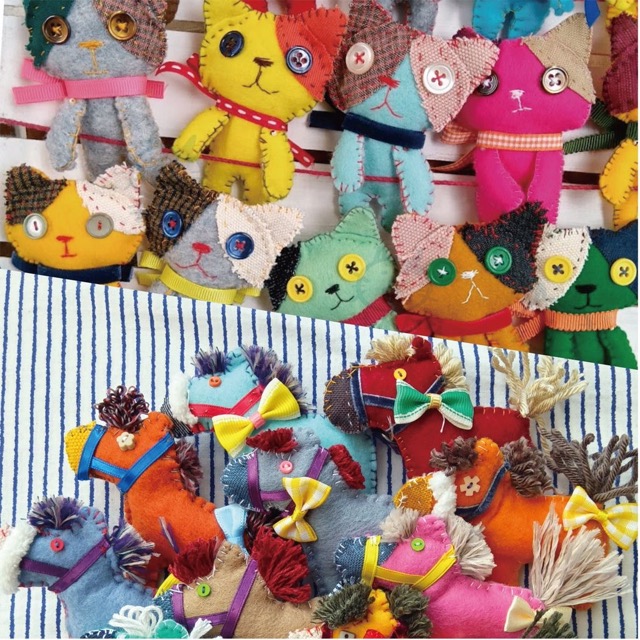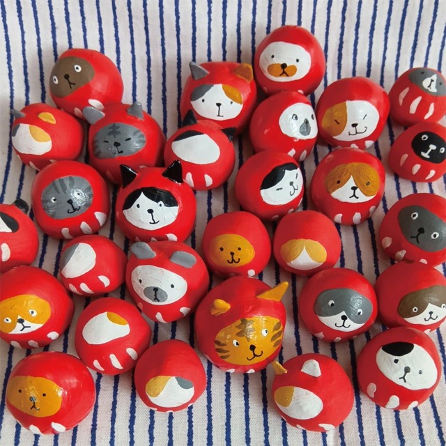 - ちんまり寄り添う 猫や犬や馬の小さく可愛いものを並べて、 フエルトバッチや小さいだるまいます。