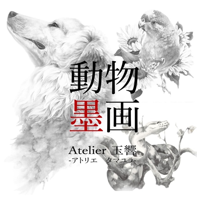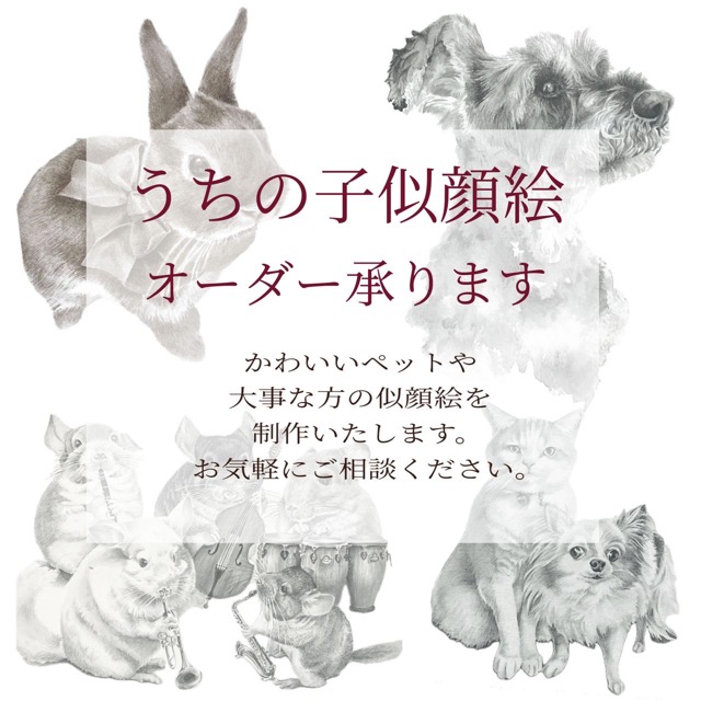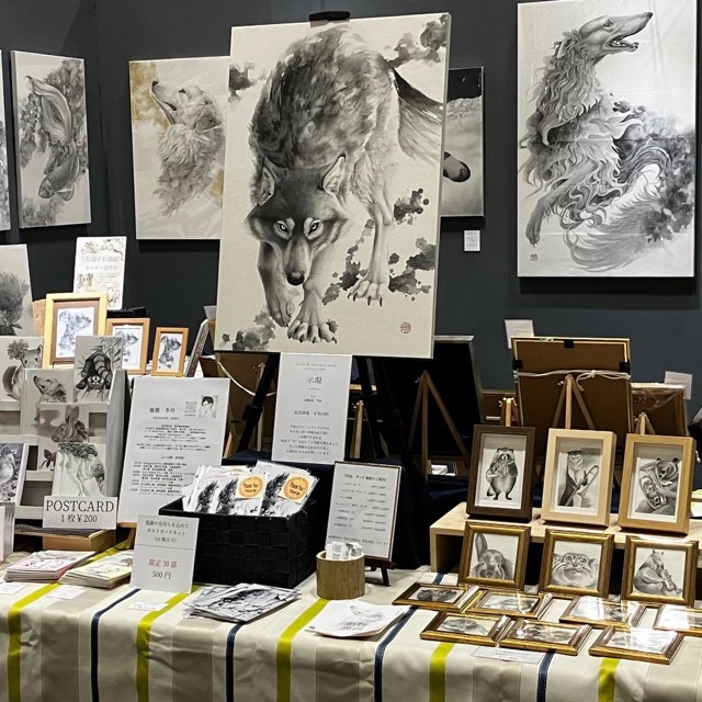 あなたの大切な「うちの子」を墨と和紙で描きませんか? 原画作品やポストカードのほか、似顔絵依頼も受付中! 会場でお待ちしています♪