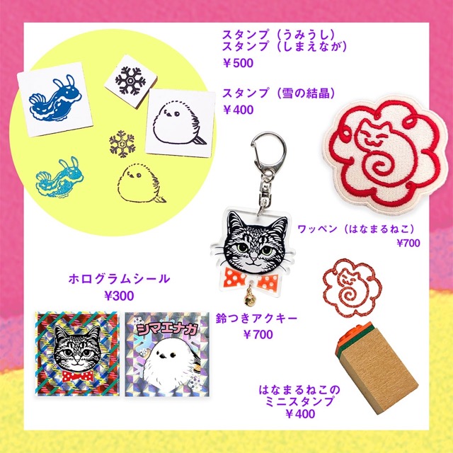 - カラフルでかわいい切り絵キットやはなまるねこのスタンプ、ネコグッズ(ステッカー、アクリルキーホルダー、トートバッグなど)を販売します。 切り絵キットは人気のシマエナガ、イルカ、ウサギ、ウミウシをはじめとした様々な生き物をご用意しております。気軽に切って飾れるキットとなっておりますので、切り絵が初めての方にもおすすめです。 東京中心で活動しておりますので、この機会にぜひ遊びに来てください!