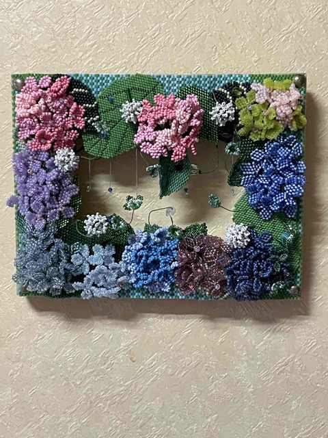 - ガラスビーズ(MIYUKI.TOHO.スワロフスキー.チョコビーズなど)を針と糸で編むオフルームビーズワークでイラストから作図し制作まで全て1人でやっています。 ペットの似顔絵やSNS等のアイコンをビーズで作り上げブローチなどにもできます(依頼を受け制作) 立体アート(実寸大位の花)作品も作っています。