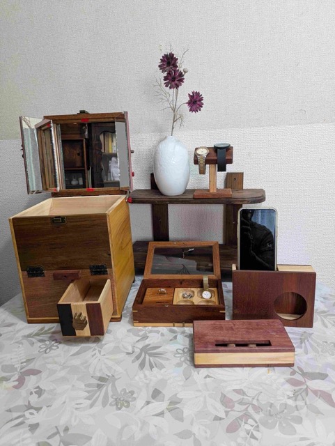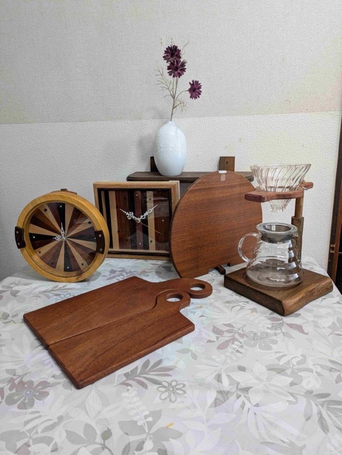 - ひのき無垢材をメインに日常家具の時計、ミラー、メイクボックス、カッテイングボード。趣味関連のスマホスピーカー、スパイスボックス、コーヒードリッパースタンド。キッズ商品のアニマルの切抜き、プルバックカー、チャイルドチェアー等の製作、販売しています。手作り木工品でひのきの香り届けます。
