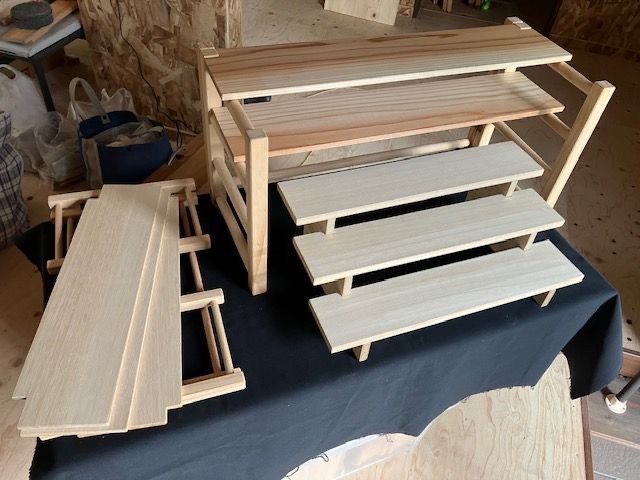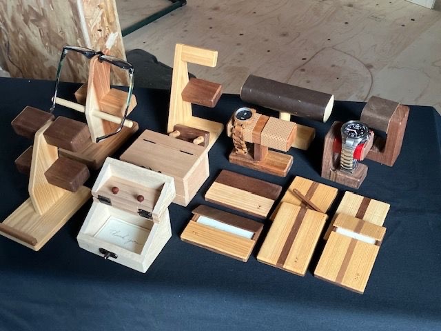 - 違う種類の木を組み合わせた文具系木工小物 名刺入れ、ウォッチスタンド、スマホスタンド等。什器やペット食事台等もあります!