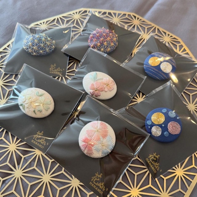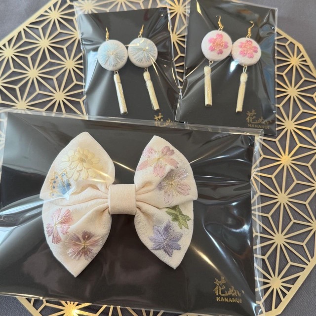- 絹の布に絹の糸で花や季節を感じられる風物、日本の伝統模様を刺繍しました。 ピアス、ポニーフック、帯留、帯飾り、ブローチなど日々の暮らしに日本刺繍の小さいかわいい物を取れ入れていただきたいと思っています。