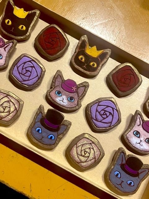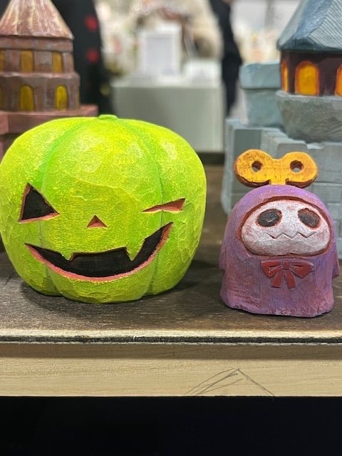 めるへん木彫り屋さんの黒屋です。ハロウィンカボチャや月やお城の小物、猫ちゃんや薔薇のピンブローチなどがあります。手作りの為、1点1点全て表情が違います。お気に入りの子を探してみてください...!
