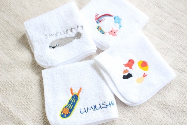 刺しゅうのTシャツ、バッグ、ポーチ、ハンカチ