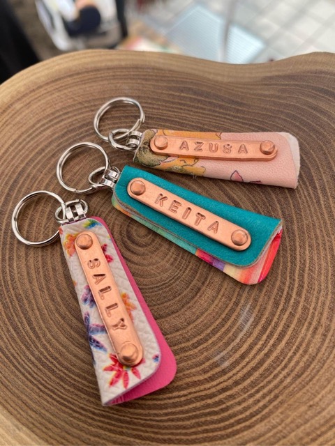 - 1000種類以上の中からお好みの革を選んでいただき、その場でお客様のお名前刻印した革製キーホルダーを1個90秒でお作りいたします。短時間で完成するのでお子様にも職人芸を楽しんでいただけると思います。