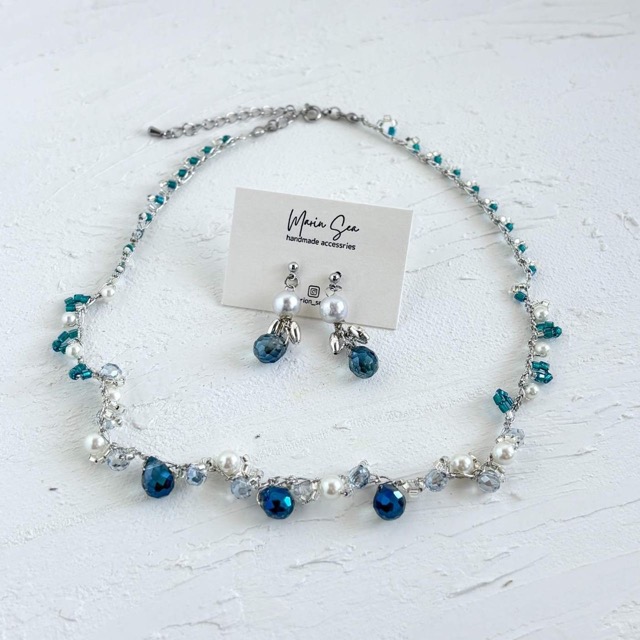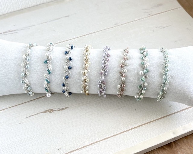 - ラメ糸にパールやビーズを編み込んだ、軽やかでしなやかなアクセサリー。糸ならではの柔らかな動きと、長時間身につけても疲れにくい軽さが特徴です。 初夏の風を感じる「夏色」のネックレスやブレスレットを中心に、日常から特別な日まで彩りを添えるデザインを追求。一点ずつ手作業で丁寧に仕上げた、繊細な色合わせと素材感をお楽しみください。