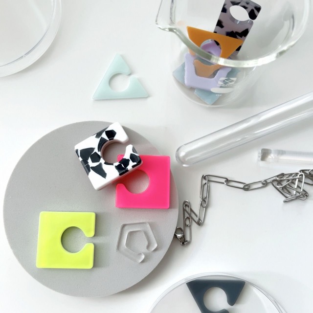 - 「 シンプルなカタチ × ユニークなアクセント 」をテーマにした、日常を彩るプラスワンアイテムを目指す幾何学アクセサリー。 オリジナルアクリルパーツをゼロから制作し、ミニマルな図形から無限に展開するエッジの効いたデザインをイメージして制作しています。