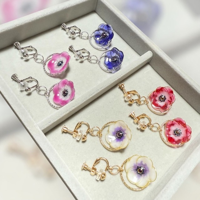 - レジンとワイヤーで、ひとつひとつ手作りしています。 色の重なりや透明感にこだわり、日々に小さなときめきを添えるアクセサリーです。