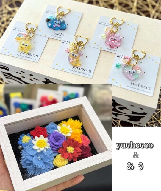 - 【yuchecco】「大切な人とおそろいにしたくなる」がコンセプト。レジンでカラフルなアクセサリーやキーホルダーを作製しています。親子、姉妹、お友達、推し活etc...yucheccoの作品で毎日がより楽しくなりますように!【あう】フェルトで作るフラワーアートを中心にアクセサリーなども作ってます。フェルトの優しい風合いとカラフルな色使いで、気分が明るくなるような作品を皆様に届けられると嬉しいです!