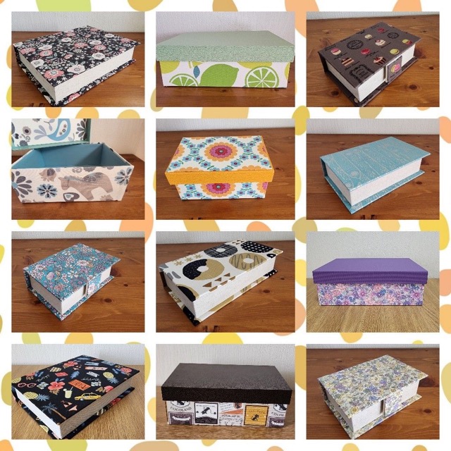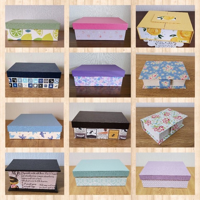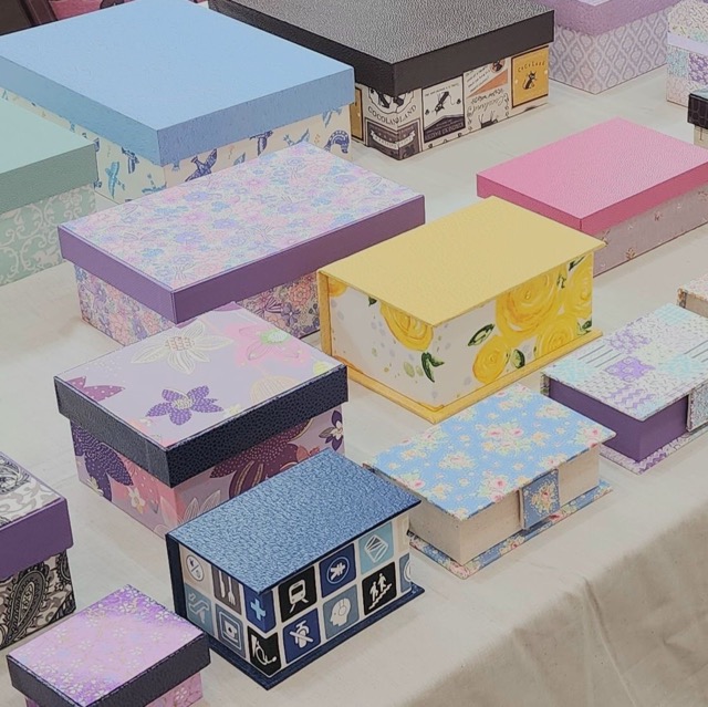 - フランスの伝統工芸であるカルトナージュの技法でハコを作っています。貼る素材によってどんなイメージにも仕上げることができます。普段使いのお道具箱やプレゼント、大切な思い出の品をしまっておくのにおすすめです。あなただけの理想のハコを探しにきてくださいね。