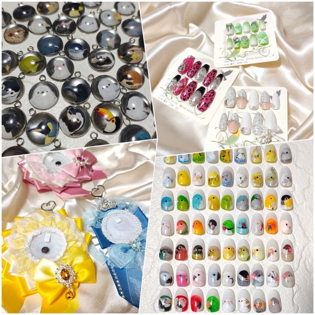 - 推し活にぴったりなカラフルなネイルチップやビーズアクセサリー、ロゼットなど...これ推しっぽい!を見つけられる空間を目指していますさらにインコや文鳥、シマエナガ、ペンギンなど様々な鳥のイラストネイルやチャームも作成しています・◇・【皆様の"大好き"を詰め込む】をモットーにした3人の作家が織りなす"大好き"の世界で、お客様の心に留まる一点が見つかりますように...。:*.・*