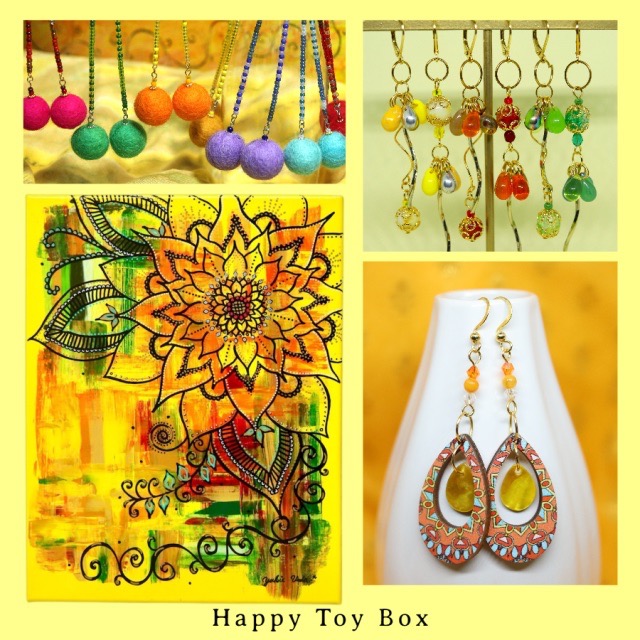 抽象画、粘土細工、アクセサリーや缶バッジなど