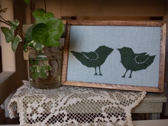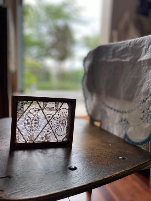 - 裏地もきれいなミナペルホネンの素敵な刺しゅう生地を絵画に見立て、ハンドメイドのフレームでファブリックパネルにしました。板張りではない独自の構造でリバーシブルに飾ることができ、生地が光を通して作品の表情が一日の間で変わります。