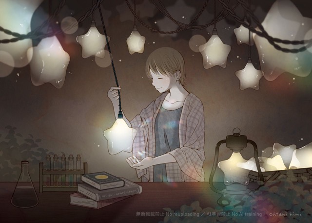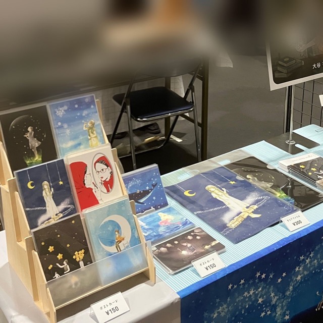 ポストカードやイラスト本の展示・販売をします。星・夜空を扱った、物語性のある少年少女イラストが多いです。