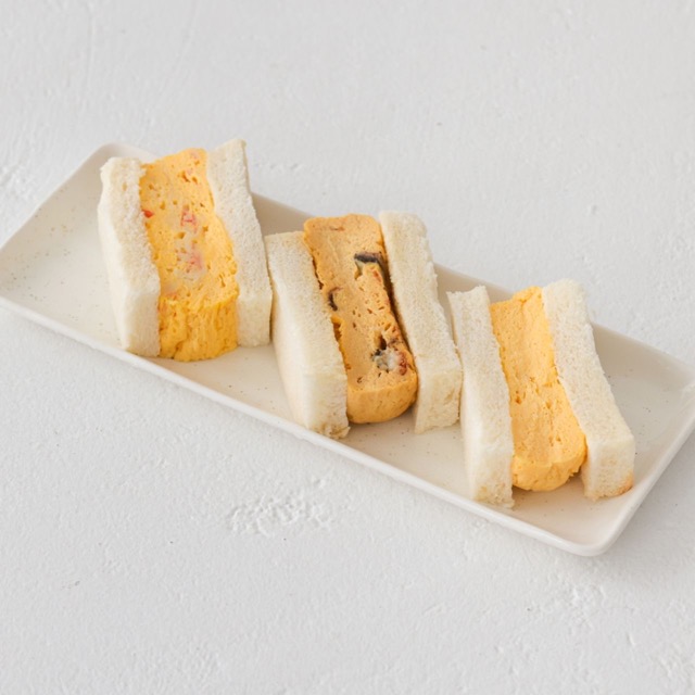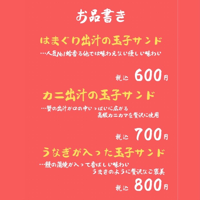 - ▼うまきの玉子サンド ・・・ うなぎの蒲焼が玉子の中に入って贅沢な味わい、香ばしい風味が玉子と合います。 ▼カニ風味の玉子サンド ・・・蟹の出汁が広がるカニ玉です。 中にはカニカマが入って蟹好きにはたまらない玉子サンド。 ▽蛤出汁の玉子サンド ・・・人気No.1は変わらず残り続けます。 蛤の出汁にほのかな甘味が絶妙な玉子サンド。