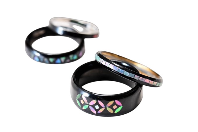 - 螺鈿工房おりはしは、伝統技法「螺鈿」で 現代の装いに映えるアクセサリーを制作しています。黒×虹色、視線を奪う。 一点物の螺鈿リングと、映えるらでんネイルチップ。