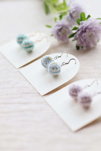 - てまりは古くから日本各地で作られてきた玩具で、『まぁるく、優しく、美しく』持つ人の幸せを願って作られ『まるく収まる、身を守る』と人生の節目に贈られてきました。優しい祈りの込められた模様を、手毬が生まれた頃と同じ草木染の糸で作って、身近に楽しめるアクセサリーにしています。和装や浴衣にはもちろん、洋装にもぴったりです。