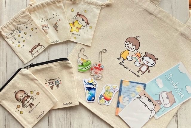 - 日常の中にほんの少しの彩りをお届けするため、オリジナルキャラクターボクとカワウソグッズを展開中!ステッカー、メモセット、アクリルキーホルダーや、手描き巾着やポーチ、トートバッグなどをご用意しています。