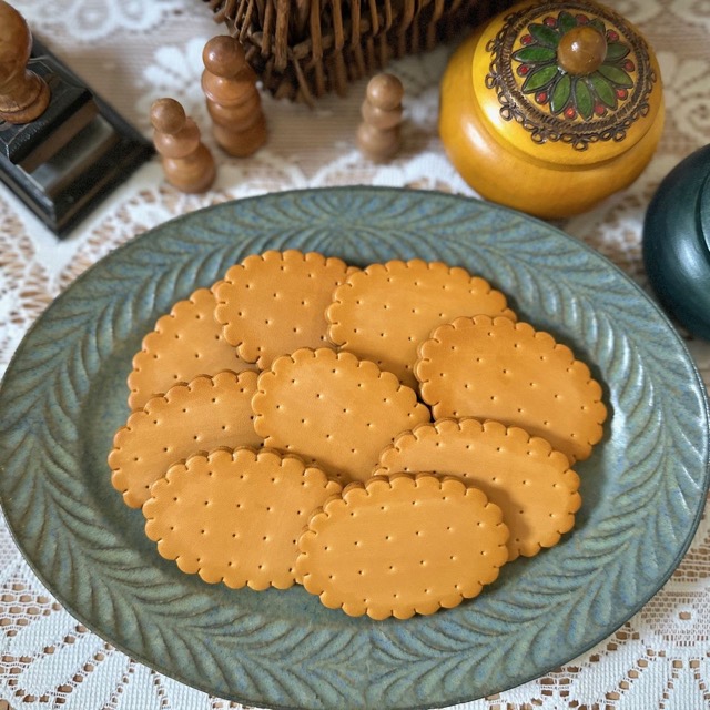 - 独学で始めた革小物の制作の中で、使い込む程にアメ色に変化する牛ヌメ革に魅力を 感じ、毎日使えて楽しいモチーフとして革ビスケットを作り始めて20年以上が経ちました。 今も一つ一つ手作りこだわっています。 当日は革のビスケットへの刻印サービスも承ります。