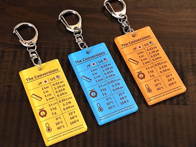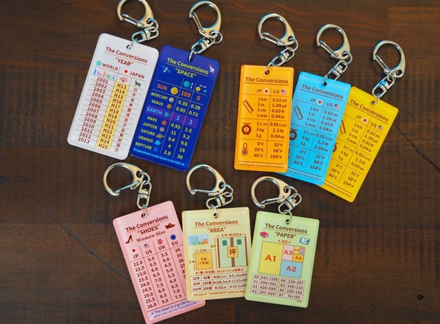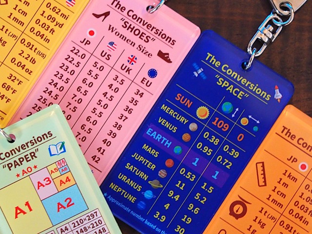 - 「変換」をテーマとする知的情報をデザインしたアクリルキーホルダーになります。日米の計測単位を変換する「The Conversions」の他、紙のサイズを変換する「PAPER」、太陽系の惑星の大きさや距離を変換する「SPACE」、西暦・元号・干支を変換する「YEAR」、面積を変換する「AREA」、靴のサイズを変換する「SHOES」とバリエーションは様々。コンセプトは「実用性+遊び心×デザイン」です。