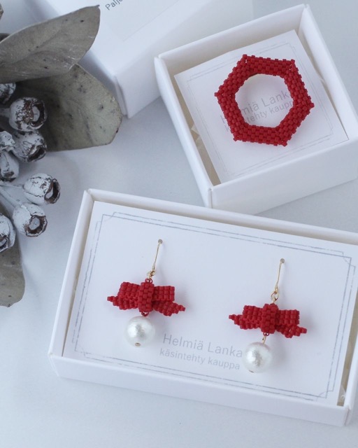 - 針と糸でビーズを一粒ずつ編んでいくビーズステッチという手法で、アクセサリーを制作しています。 ショップ名のHelmia Lankaは、フィンランド語でHelmiaがビーズ、Lankaが糸という意味です。