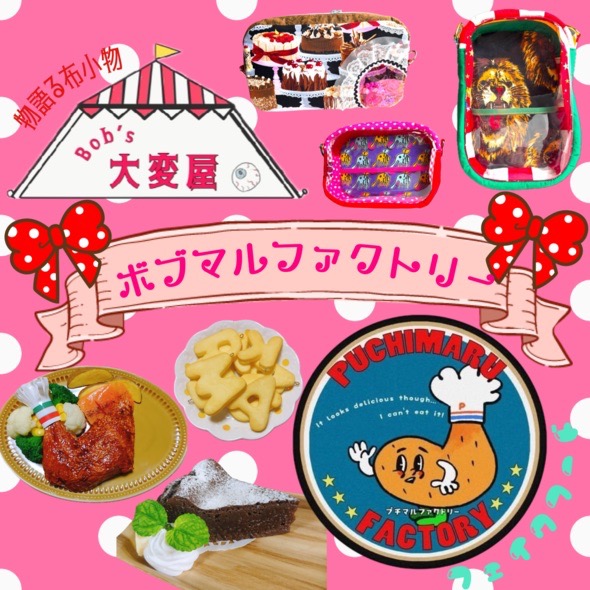 - キュートでポップでマニアックな物語る布小物を制作しているBob's大変屋と、ジャンキーなフェイクフードを制作しているプチマルファクトリーが合体した特別サークルです。 合同参加だからこそ出来る唯一無二!美味しくて狂おしい世界をお楽しみください。
