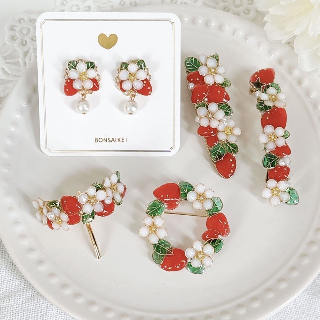 - 季節のお花モチーフを中心に、 花びら1枚1枚をワイヤーを曲げるところからお作りしたアクセサリーを販売しています。 お色味は赤を中心に鮮やかなもの、 コーティングをしたつるつるの仕上がりが自慢です。