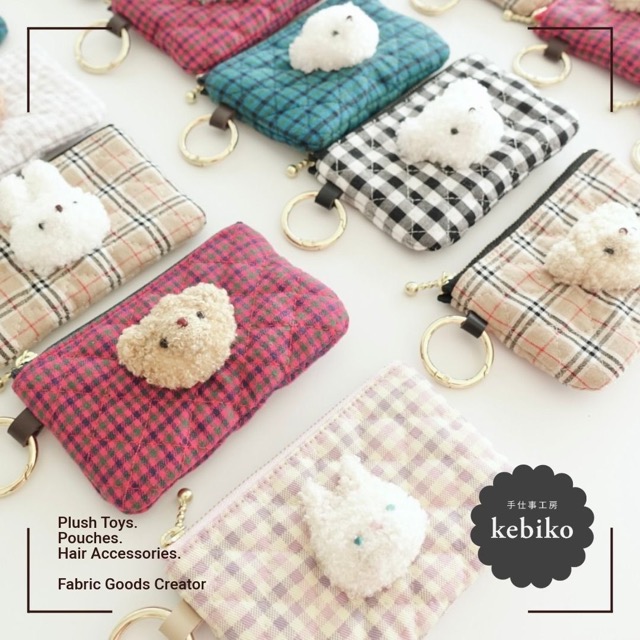 - ぬいぐるみ制作の手法で仕立てた、ふわもこアニマル付きの布雑貨を制作しています。ポーチや巾着など日常で使いやすいアイテムを中心に、可愛いけれど落ち着いたデザインが特徴です。極力洗える素材を選び、接着剤を使わず丁寧に仕立てているため、お子さまへの贈り物から大人の方まで安心して長くお使いいただけます。たくさん並んだ中から「この子だな」と感じる出会いをお楽しみください。