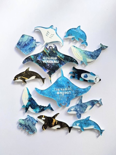 海の生き物の一点物キーホルダーやアクセ、絵本など