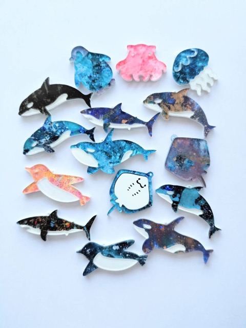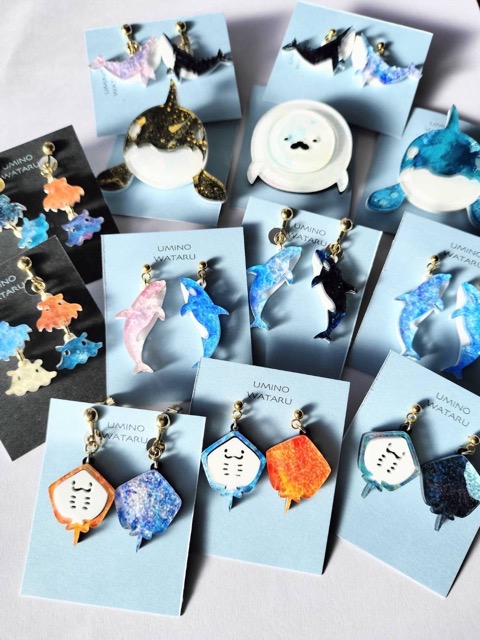 - シャチを中心に、海の生き物をモチーフとした一点物のキーホルダーやアクセサリーを制作しています。星空や深海、オーロラを思わせる色彩を手塗りで重ね、同じものは二つとない“海の色”を表現しています。今回はシャチをテーマに描いた物語アートブックも初出展します。