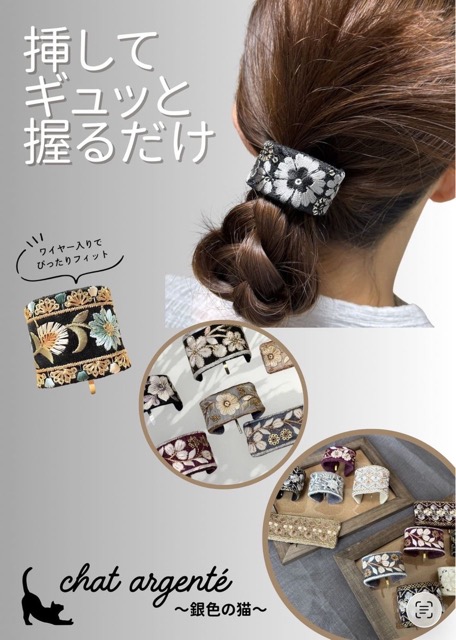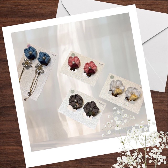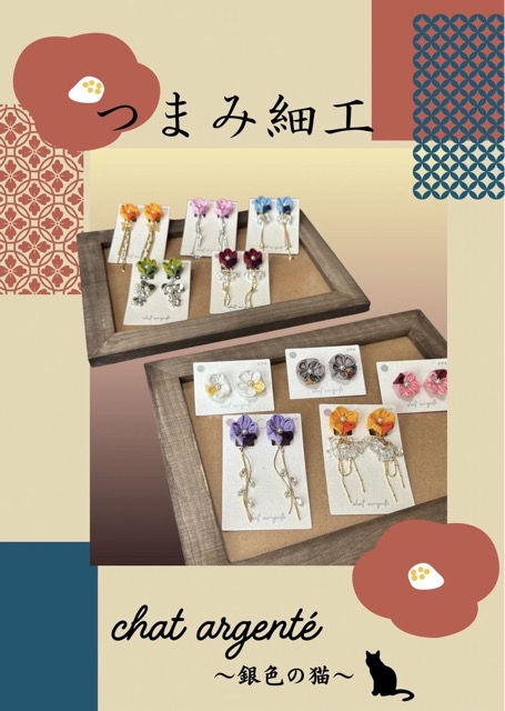 - つまみ細工のピアスとイヤリング、インド刺繍リボンや金らんの布を使ったヘアアクセサリーを作っています。〜和の素材をカジュアルに楽しむ〜使い勝手の良さと可愛らしさにこだわった手仕事ならではの繊細な作品が、お顔周りを華やかに彩ります。