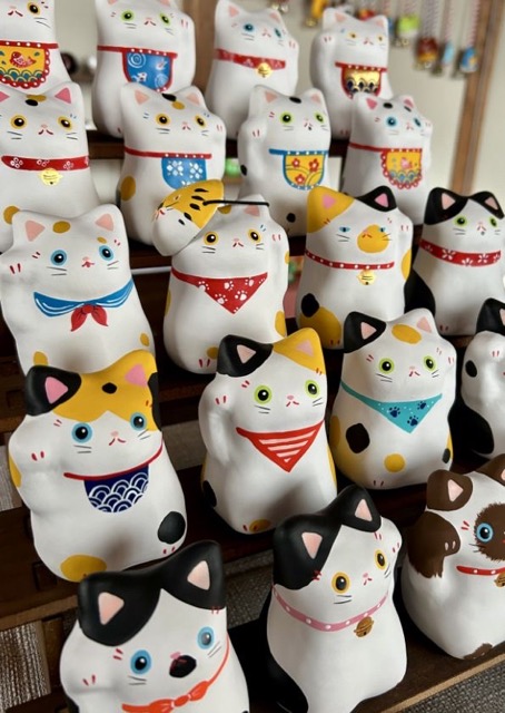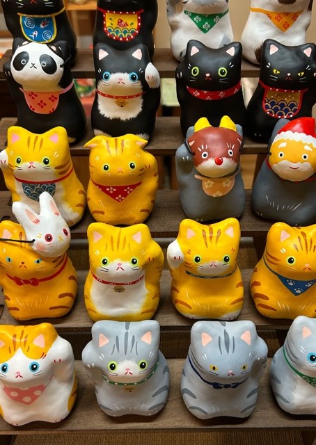 - 和紙で出来た張り子の招き猫。 この招き猫には小さなお面をつけることができます。お面にはおかめやひょっとこなどの縁起物、サンタやトナカイのような季節の飾り物などを招き猫と組み合わせてお楽しみいただけます。